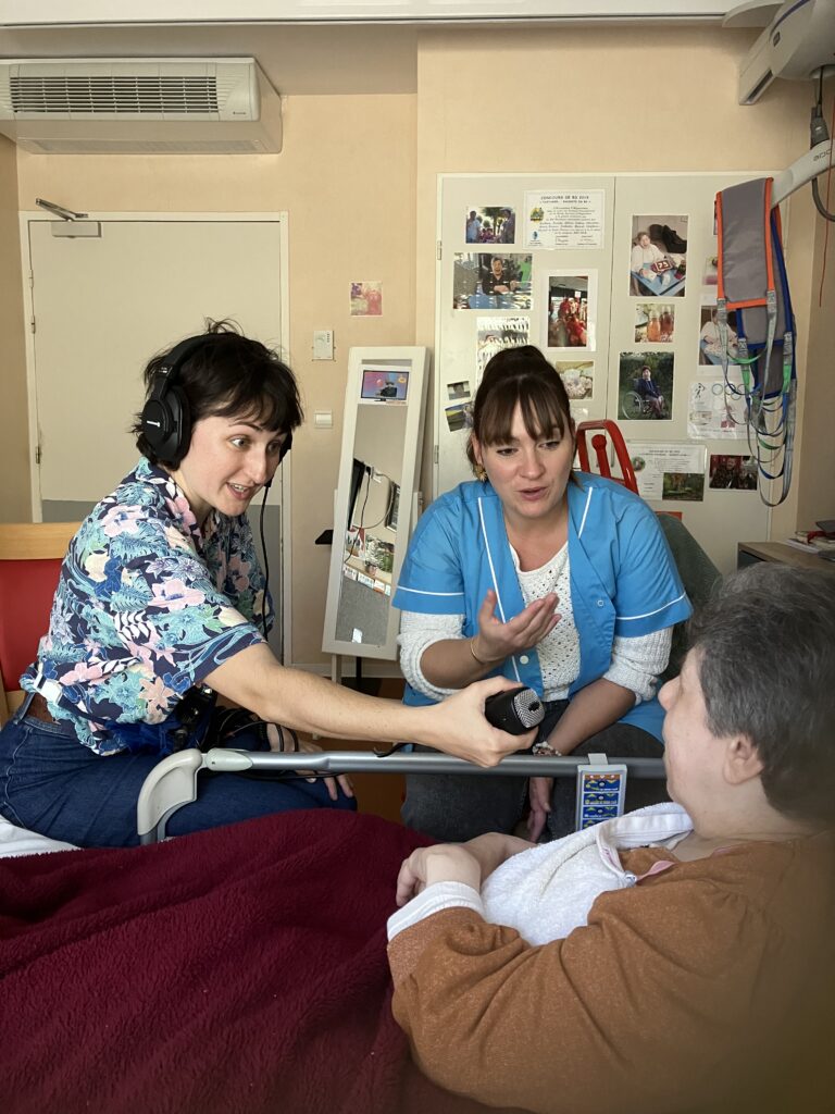 Mais au sein de la compagnie il y aussi la scénographie qui est menée par David Mendes, avec les mains des personnes âgées, de l’accueil de jour La Source. Nous avons aussi invité Céline Lemoine, réalisatrice sonore, à venir interroger les participant.es sur leurs souvenirs. Cela a donné de beaux moments de paroles, où l’on pouvait notamment voir la complicité entre des professionnelles et des participant.es au projet (comme avec Charlène et Marie-France ci-dessous).